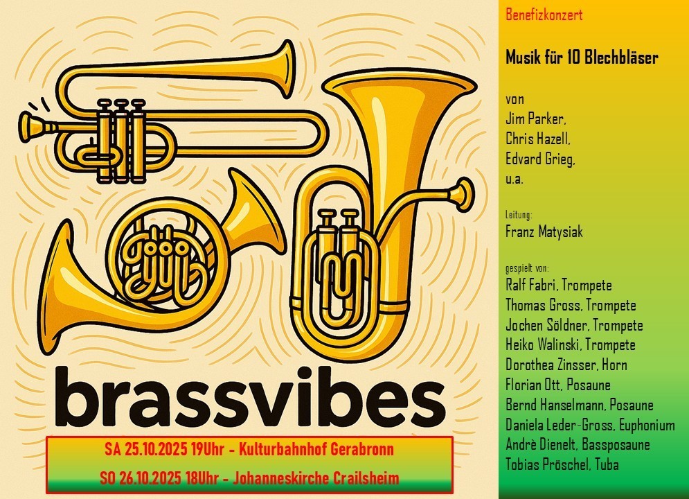 Unter der Leitung von Franz Matysiak, Musikdirektor der Stadt Crailsheim, lädt das Blechbläserensemble brassvibes am letzten Oktoberwochenende zu zwei besonderen Konzerten in der Region ein. Die Auftritte stehen ganz im Zeichen musikalischer Vielfalt – und des guten Zwecks: Der Erlös kommt der Jugendkapelle Crailsheim zugute, die im kommenden Jahr eine Konzertreise nach Schweden plant.